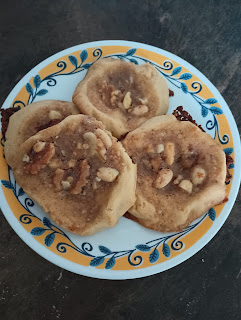 Ça fait 2 fois dernièrement que mon mari me dit je veux des biscuits croquant. Au dernier que j'ai fais ça m'a pas semblé le satisfaire car il est revenu avec ça! Alors là je lui ait sortie du croquant! Ce sont des biscuits mou avec au milieu une petit mélange avec des noix. C'est supposé être juste noix de grenoble mais j'en ai manqué alors j'ai ajouté des amandes (sans peau)